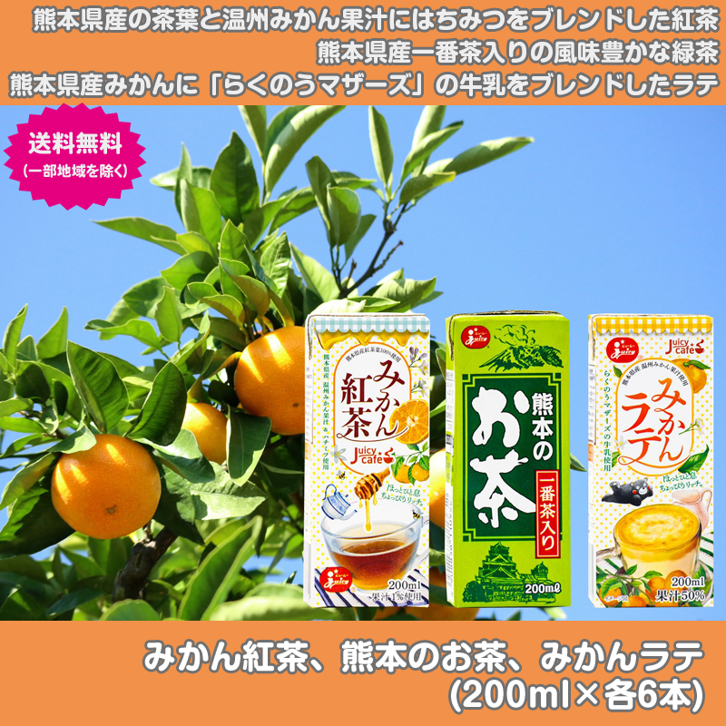 熊本県産の茶葉と温州みかん果汁にはちみつをブレンドした華やかでスッキリとした味わいの「みかん紅茶」、熊本県産一番茶入りの風味豊かな「熊本のお茶」、熊本県産の温州みかんに「らくのうマザーズ」の牛乳をブレンドしたまろやかな甘みを味わえる「みかんラテ」の詰め合わせ。