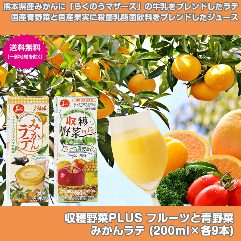 熊本県産の温州みかんに「らくのうマザーズ」の牛乳をブレンドしたまろやかな甘みを味わえる「みかんラテ」、ほうれん草を中心とした国産青野菜8種と国産果実3種に、殺菌乳酸菌飲料をブレンドしたヨーグルト風味の「収穫野菜PLUS フルーツと青野菜」の詰め合わせ。